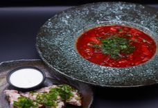 Борщ с говядиной, с бородинским хлебом и шпиком